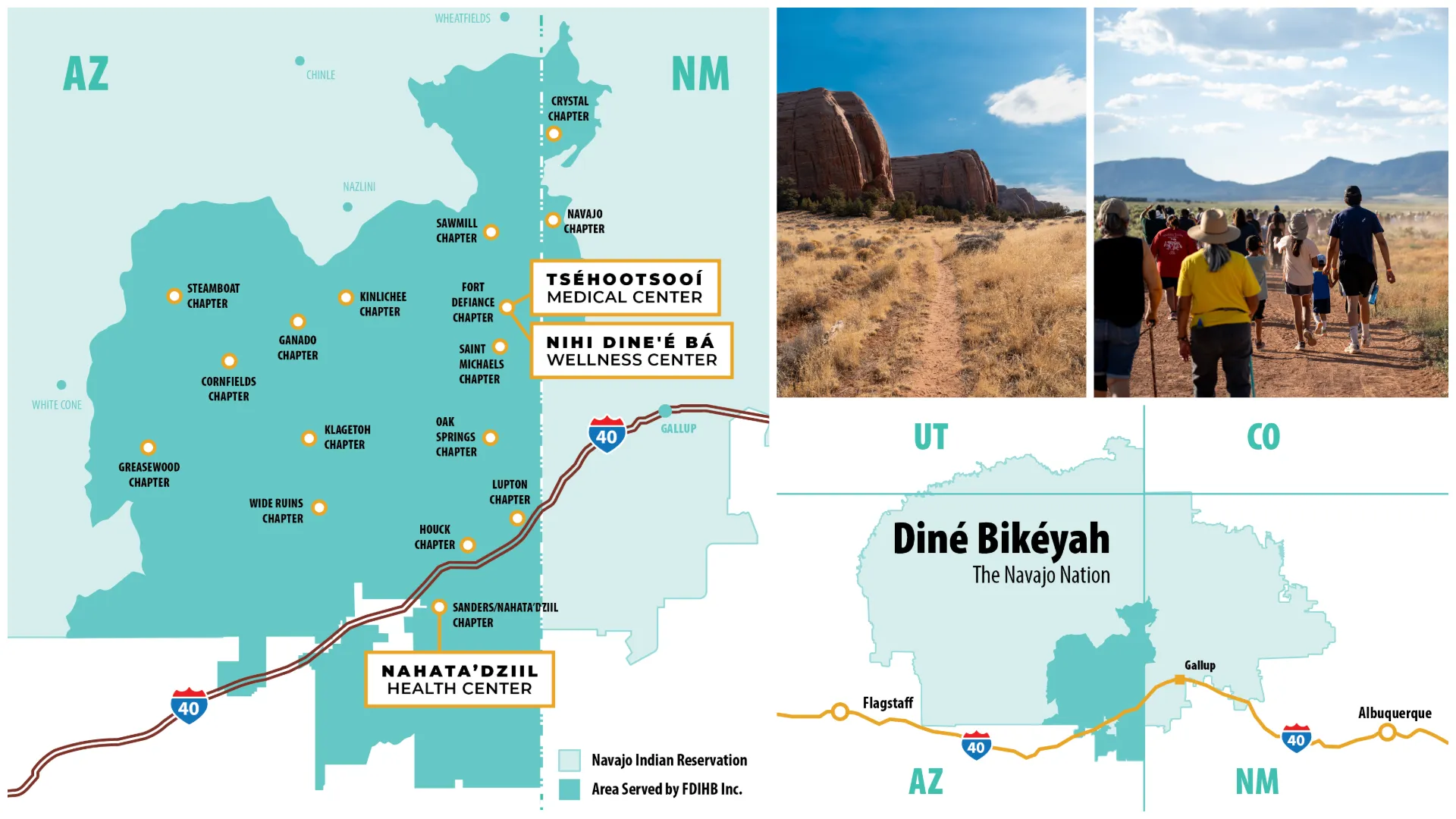 In 2018 NDBWC opened to provide an integrated and coordinated health care system where health promotion/disease prevention and medicine will come together to assist people on their Journey to Hozho. NDBWC is a facility with seven TMC departments, classroom space, physical therapy, education kitchen, and full-size fitness center that includes an indoor elevated track, volleyball/ basketball court, and fitness classrooms.