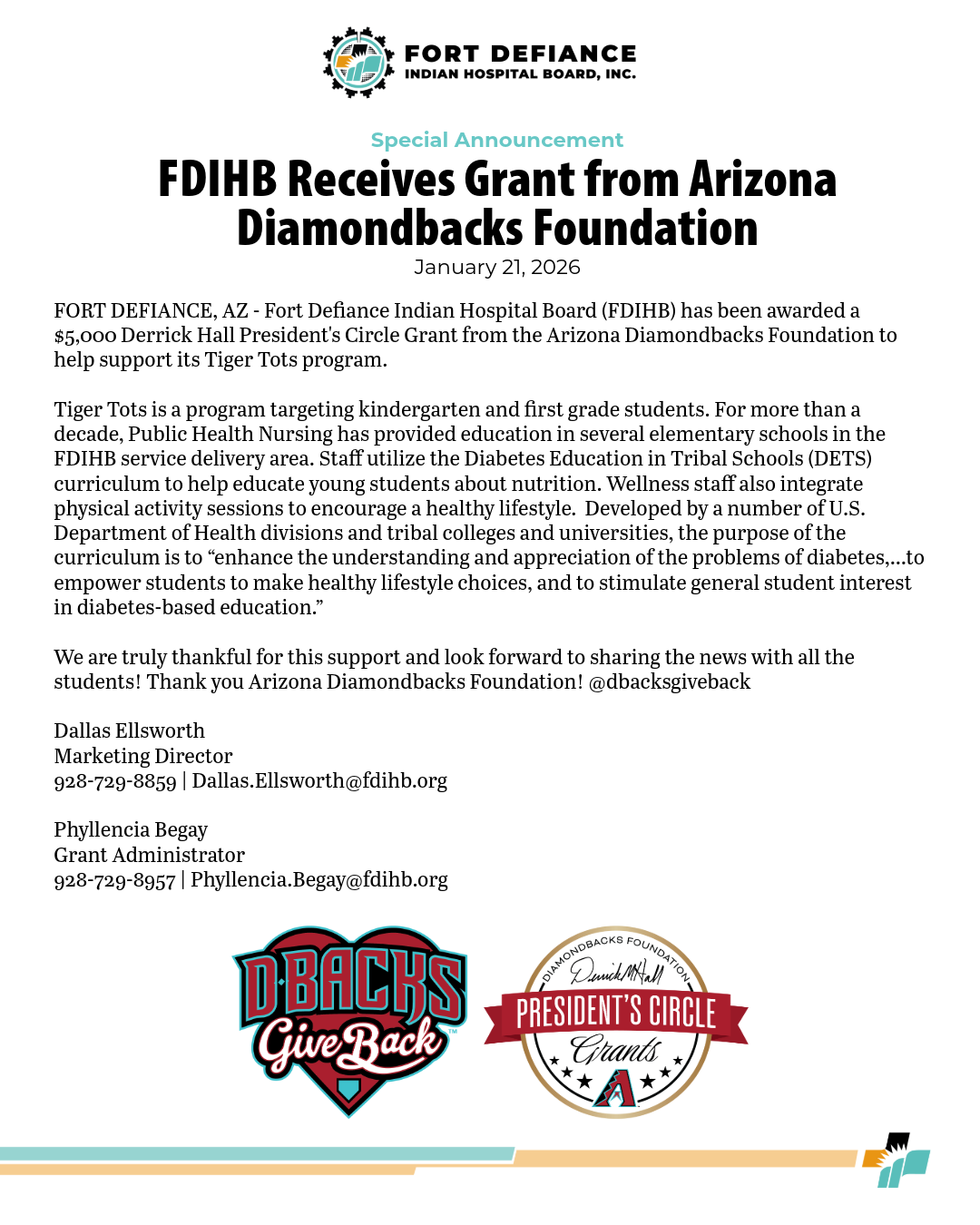 FORT DEFIANCE, AZ - Fort Defiance Indian Hospital Board (FDIHB) has been awarded a $5,000 Derrick Hall President's Circle Grant from the Arizona Diamondbacks Foundation to help support its Tiger Tots program.