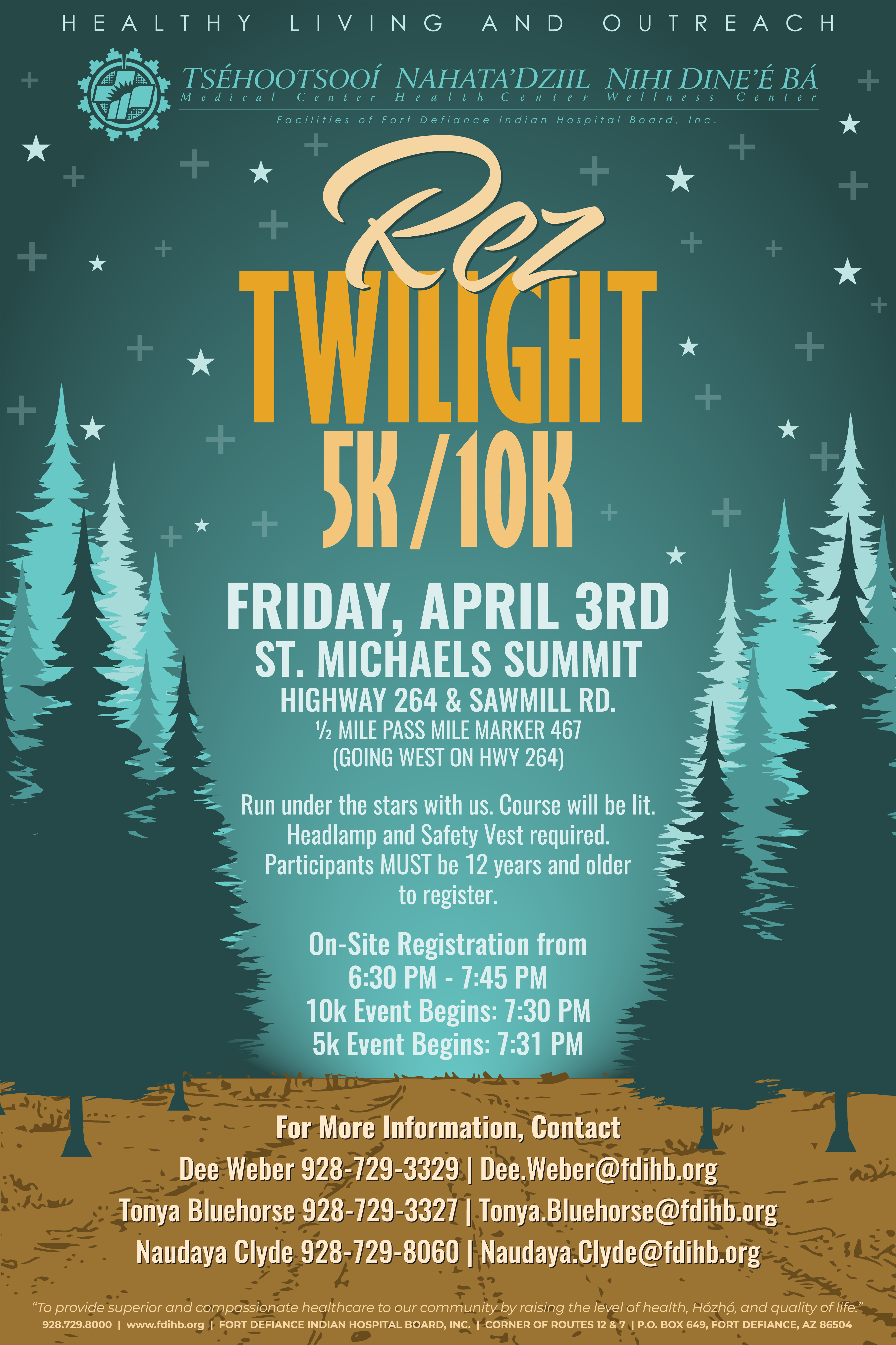 Rez Twilight is a 5k/10k fun run/walk on April 3, 2026 at 6:30pm at the St. Michaels Summit.