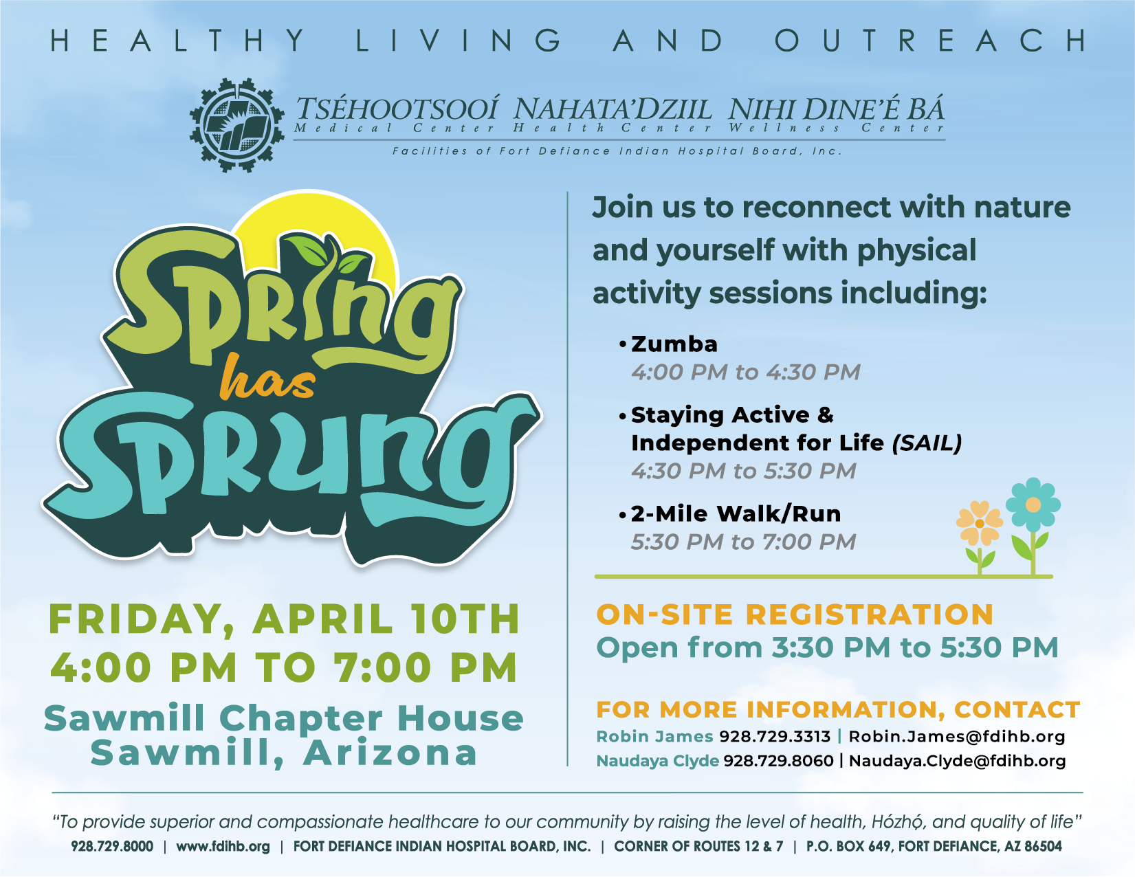 Say hello to spring and join us for the Spring Has Sprung Event on Friday, April 10th, 2026, at the Sawmill Chapter House in Sawmill, AZ! Reconnect with nature and yourself with physical activity sessions including Zumba, Staying Active & Independent for Life (SAIL), and a 2-mile walk/run. On-site registration will occur from 3:30pm to 5:30pm. The event will begin at 4:00pm. For more information, please contact Robin James at (928) 729-3313 | Robin.James@fdihb.org or Naudaya Clyde at (928) 729-8060 | Naudaya.Clyde@fdihb.org. See you there!