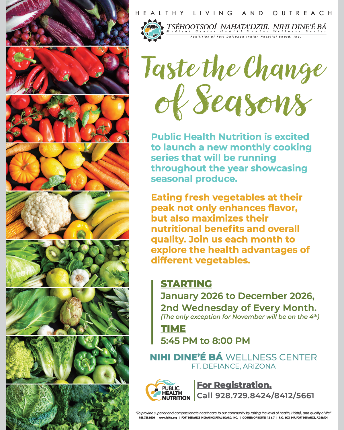Discover the nutritional advantages and quality of various seasonal vegetables each month. You'll learn how to incorporate these fresh ingredients into your cooking for delicious, healthy meal. Don’t miss out on this opportunity! To register, please call 928-729-8424 or extensions 8412 or 5661.